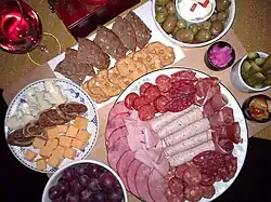 ![]() A charcuterie board with various cured meats, cheeses, and fruits | |