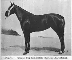 The horses of the Charente basin were, according to Jean-Henri Magne, "as varied as the earth that nourishes them." To the west, in the marshes of Rochefort and Marennes, one could find horses with thick skin, strong manes, wide feet, poorly-formed legs, long and spindly barrels, capable of going for a long time without drinking, yet difficult to break in.[5] André Sanson summarized their history as follows:[6]