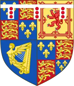 Although he was only a grandson of a British Sovereign, by the time of his birth it had become obvious that his uncle would not have any children, so he received a coat of arms as if he were a son of the Sovereign. Said arms consisted of those of the kingdom, differenced by a label argent of three points, on each three torteaux gules.[1]