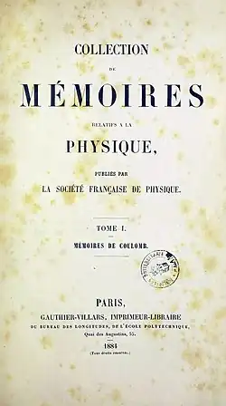 - ^ Coulomb (1789) "Septième mémoire sur l’électricité et le magnétisme," Histoire de l’Académie Royale des Sciences, pages 455–505.
