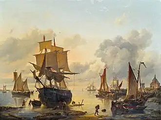 After 1842, he used brighter colors and his style became more realistic. Very often, the foreground figures were provided by his brother, who reportedly performed the same service for several well-known landscape painters. Many of his works are set in small harbors along the Scheldt, which have since disappeared and cannot be identified with any certainty.