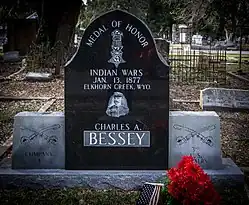 On that day, Bessey and three privates were repairing a telegraph line between Forts Laramie and Fetterman in eastern Wyoming Territory when they learned that Native Americans had attacked three herders close by,[3] near Elkhorn Creek.[1] Bessey led his small group against the much larger Native American force and successfully rescued the herders, although he and two of his men were wounded in the process.[3] For these actions, the four men were commended in general orders[3] and, thirteen years later on May 15, 1890, Bessey was awarded the Medal of Honor.[1]