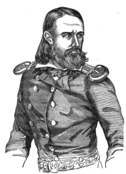 He led his cavalry squadron on the charge and, despite heavy casualties, secured the objective and silenced the guns before being forced to withdraw due to a lack of infantry support. The dragoons also captured one of the Mexican commanders, General Rómulo Díaz de la Vega, on the gun line. With the Mexican artillery out of action, the 8th Infantry Regiment and 5th Infantry Regiment were able to maneuver forward and eventually drove the enemy from their positions.[11] Of approximately eighty men, the dragoons lost one lieutenant, seven privates, and twenty-eight horses, with an additional ten privates wounded.[8] Colonel David E. Twiggs, the regimental commander, commented that "After the unsurpassed, if not unequalled charge of Captain May's squadron, the enemy was unable to fire a gun."[2] In his official after-action report, Taylor wrote that "The charge of cavalry against the enemy's batteries on the 9th, was gallantly led by Captain May, and had complete success."[11] After the battle, May received two brevets to the rank of lieutenant colonel.[2]