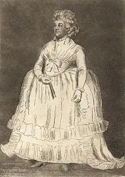 He was said to have 'one of the most extensive falsettos ever heard'.[22] Garrick took Felice Giardini to hear Bannister's imitations of Tenducci and Champneys, and the composer observed that the mimicry was perfect, but the fault was that the mimic was better than the performers themselves.[23] Michael Kelly refers to his appearance as Polly in a travesty of The Beggar's Opera at the Little Theatre in the Haymarket in 1781, in which he 'gave her tender airs with all the power of his deep and sonorous bass voice.' He brought it off not by mimicking feminine intonation or mincing gait, antics or 'superadded drolleries', but by the ridiculous incongruity of his deep voice and muscular frame, by an occasional display of ankle, and by the perfect judgement with which he sang Polly's songs.[24] This was heard with great disgust by the visiting Italian male soprano Ferdinando Mazzanti, who did not realize it was a burlesque production.[25]