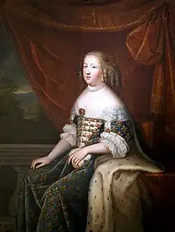Beaubrun made many portraits of the reigning French queens, painting according to the prevailing court conventions. Thus certain similarities are evident between his portrait of Maria Theresa of Spain (Maria Theresa, Infanta of Spain), queen to Louis XIV, and an earlier portrait of Anne of Austria, queen to his father Louis XIII (both shown here) even wearing the same regal gowns.[2]