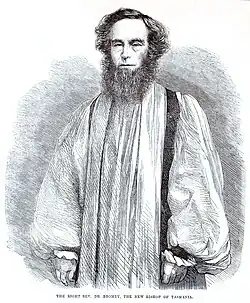 Bromby was made deacon in Lichfield in 1838 and served as curate at Chesterfield from 1838 to 1839; and was ordained priest in 1839 in York and was headmaster of Stepney Grammar School from 1839.[1] In 1843 Bromby was appointed vicar at St Paul's, Cheltenham, and was joint-founder and principal of the Cheltenham training college for teachers 1843–1864. He published The Sorrows of Bethany and other Sermons (1846), which was followed by The Pupil Teacher's English Grammar (1848), and a volume on Liturgy and Church History (1852), the third edition of this appeared in 1862 under the title of Church Students' Manual. In 1864 he was appointed Bishop of Tasmania, the last Colonial bishop to be nominated by the crown, and was consecrated on St Peter's day 1864, by Charles Longley, Archbishop of Canterbury at Canterbury Cathedral.[2] In 1868, when the question of the abolishing of state aid to religion was dealt with, Bromby was largely responsible for the passing of the commutation act which resulted in the Church of England in Tasmania receiving about £60,000 as a perpetual endowment instead of the former yearly payments. Early in 1869 a contract was made for the building of the nave of St David's cathedral, and the cathedral was consecrated in 1874, Bromby himself acting as Dean from 1874 to 1876. In 1880 he visited England, and in 1882 resigned his see. His episcopate was marked by the building of several new churches and a great increase in the number of clergy.