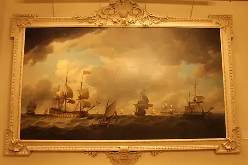 Except for paintings such as this, which record specific historical events, Brooking’s early works are not easy to date more precisely, other than stylistically and by theme, and have not yet been closely examined for their chronological development. His first two pictures show some influence of Peter Monamy, but he was already displaying strong signs of a distinctive personal manner. He soon drew away from the native traditions of the marine genre, which included formal ship portraiture, although there are at least two works signed by him, one now in the Maritime Museum at Greenwich, which portray a ship in this convention. There is also a group of paintings and prints, signed or inscribed "Monamy" and datable to the years circa 1745-1750, but whose style is more consistent with Brooking’s. Some of the identical prints occur with attributions by different print dealers to both painters in separate issues.