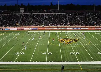 The football field has a near north–south alignment, but slightly northwest-southeast. The open end of the U-shaped grandstand is to the south, with the scoreboard. The elevation of the field is approximately twenty feet (6 m) above sea level.