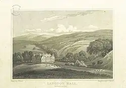 His father having died in March 1807, Calmady matriculated at Oriel College, Oxford in July of that year, aged 16.[7][8] Lysons (1822) gave his residence as Holne Chace, on Dartmoor.[3] His mother died aged 73 in 1828 at Langdon Hall, Devon, the family seat in the parish of Wembury, about 5 miles (8.0 km) from Plymouth.[9][10] She had bought West Wembury farm, from the Lockyer family, and owned also the barton at Down Thomas, where the manor belonged to Edmund Pollexfen Bastard.[11]