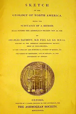In 1837 he visited the United States and acquired there the materials for papers on the thermal springs and the geology of North America, read in 1838 before the Ashmolean Society and the British Association (and published in 1839). In 1856 he became president of the latter body at its meeting at Cheltenham.[4] The herbarium at Oxford is named after him, as is the plant genus Daubenya.[10]