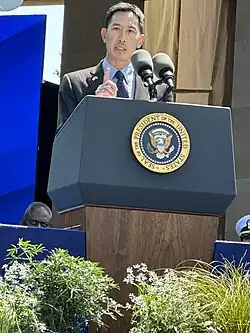 In 2020, Djou endorsed Democrat Joe Biden for President alongside 26 other former Republican members of Congress.[57] In May 2022, President Biden appointed Djou to be secretary of the American Battle Monuments Commission.[4] In August 2024, Djou wrote an op-ed for Fox News praising 2024 Democratic vice-presidential nominee Tim Walz.[58] When President Trump succeeded Biden, Djou stepped down and was succeeded by ABMC deputy secretary Robert J. Dalessandro in an acting capacity.[59]