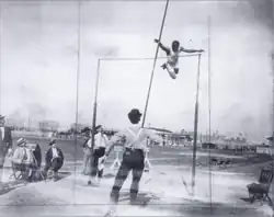 In 1900, funds were solicited from faculty, students, alumni and Ann Arbor businessmen to send Dvorak, three other Michigan track athletes, and Coach Fitzpatrick to the 1900 Summer Olympics in Paris.[16] In Paris, Dvorak missed the event finals following a controversy over the scheduling of certain event finals for a Sunday. Several American athletes agreed they would not violate Sabbath. The pole vault, in which Dvorak was a favorite, was one of the events scheduled for Sunday.[17] Two of the Americans (Dvorak and Bascom Johnson) nevertheless went to the Racing Club grounds where the event was to be held. They were told not to worry, that the event had been rescheduled.[18] The officials later changed their decision, and the event was held after Dvorak and Johnson had left.[17] Irving Baxter won the competition with a jump of 10 feet, 10 inches.[19] Because of the confusion, a special, albeit unofficial, competition was arranged for the athletes who had not participated in the Sunday event. Dvorak took the silver medal in the special competition with a jump of 11 feet, 1-3/4 inches.[19][20][21]