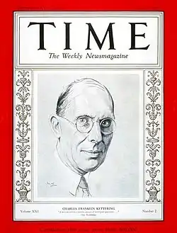Charles Franklin Kettering (August 29, 1876 – November 25, 1958) sometimes known as Charles Fredrick Kettering[1] was an American inventor, engineer, businessman, and the holder of 186 patents.[2] He was a founder of Delco, and was head of research at General Motors from 1920 to 1947. Among his most widely used automotive developments were the electrical starting motor[3] and leaded gasoline.[4] In association with the DuPont Chemical Company, he was also responsible for the invention of Freon refrigerant for refrigeration and air conditioning systems. At DuPont he also was responsible for the development of Duco lacquers and enamels, the first practical colored paints for mass-produced automobiles. While working with the Dayton-Wright Company he developed the "Bug" aerial torpedo, considered the world's first aerial missile.[5] He led the advancement of practical, lightweight two-stroke diesel engines, revolutionizing the locomotive and heavy equipment industries. In 1927, he founded the Kettering Foundation, a non-partisan research foundation, and was featured on the cover of Time magazine in January 1933.
