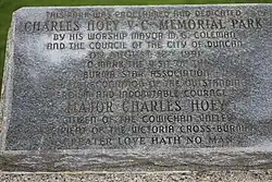 Charles Hoey VC Memorial Park has been dedicated in downtown Duncan, B.C. This park is located along Canada Avenue between Trunk Road and Ingram Street. The Cowichan cenotaph, located within the park, is inscribed with the names of area residents killed in the two World Wars and the war in Korea.
