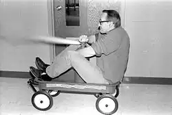 ![]() Professor Holbrow uses a fire extinguisher and a wagon to demonstrate rocket propulsion, ca 1980 | |