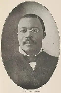 Parrish was involved in his church, having been baptised at the age of 12. In 1872, he became secretary and teacher of the Sunday school. He also worked as church clerk and assistant instructor at the night school. His work as a teacher inspired him to continue his own education, and he quit work and enrolled at the Nashville Institute in September 1878. To help pay for his education, he worked as janitor of the Jackson Street public school during the nights and worked full-time during vacation. He graduated in 1882, and enrolled in the college course. He continued to work during school, now as a student-teacher, tutor, and bookkeeper. He graduated with an A. B. in May 1886. He was then appointed secretary and treasurer of the State University, later known as Simmons College of Kentucky, as well as professor of Greek.[1] He later received an A. M. and D. D. from the same school. He also received an LL.D. from Central Law School and was granted an F. R. G. S. by the Royal Geographical Society in London, England.[2]