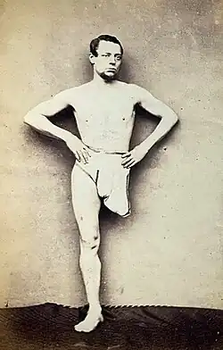He was also a highly-ranked artistic or ornamental swimmer during the Victorian period, being written up for his performances in the local newspapers.[1][5] Photographs of Moore are held by the UK National Archives, registered for copyright in 1865. The Archives note "Individuals registering images for copyright tended to do so for commercial reasons," and theorized that these photos were possibly created to be sold outside public swimming areas.[1] His official job was listed as "professor of swimming" in census records and he was said to have taught at the London Swimming Club.[6]