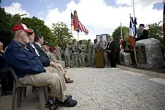 Lt. Col. Timmes was commander of the 2nd Battalion, 507th Parachute Infantry Regiment which was dropped on Mission Boston, part of the American airborne landings in Normandy on the morning of 6 June 1944.[1] The 2/507th was tasked with securing the western end of the La Fière bridge approximately 3 km from Sainte-Mère-Église, however his battalion had been widely scattered during the drop landing in grassing swampland along the Merderet river, by the end of the day Timmes controlled a group of approximately 100 men in defensive positions in an orchard. On 8 June German forces launched 4 separate attacks on Timmes' position, all of which were repulsed. A request for support was sent to the 82nd Airborne Division headquarters and a battalion from the 325th Glider Infantry Regiment was sent as reinforcements. Timmes then launched attacks on the German positions and the La Fière causeway. On 9 June the 325th attacked German positions at Cauquigny but were beaten back and withdrew to the orchard which came under renewed attack by the Germans before they were relieved later that day. The site of the battle is now known as Timmes Orchard and monuments to the 507th, the 325th and the 508th have been erected nearby.[2]