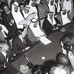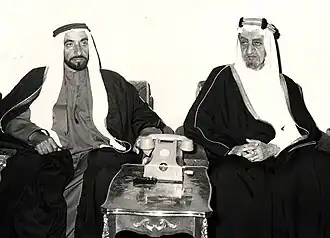 The British government under prime minister Harold Wilson in January 1968 had publicly announced his administration's will to withdraw the country's political and military presence from its colonial and suzerain protectorates in the Persian Gulf by the end of 1971, including the Trucial States.[10] This announcement came as a surprise for the rulers of the Gulf, especially of Trucial States, Bahrain and Qatar. His policy was carried forward by his successor, Edward Heath. A month later in February 1968, Sheikh Zayed al-Nahyan met with Sheikh Rashid bin Saeed al-Maktoum and signed a union agreement between Abu Dhabi and Dubai, a turning point in the history of the Gulf considered as the prelude to the unification of the United Arab Emirates since the two agreed on bringing other neighboring emirates to join the proposed federation, including Bahrain and Qatar.[11]