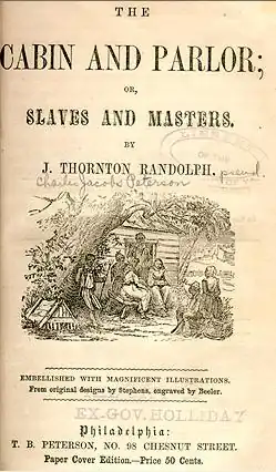 In 1852, Peterson published the novel The Cabin and Parlor; or, Slaves and Masters under the pseudonym J. Thornton Randolph, an early example of the Anti-Tom literature which arose in response to Uncle Tom's Cabin. It was published by T.B. Peterson, Ltd.; Theophilus B. Peterson was one of Charles' brothers and a leading publisher of cheap and sensational fiction.[7] He framed the argument that slave owners took a parental responsibility to the slave, whereas commercial interests in the North took advantage of the free negro.[8] It was adapted to a stage performance and was performed at the Richmond Theater in Richmond, Virginia in 1854 and 1861.[9] Peterson was not necessarily defending the institution of slavery, but instead a gradualism for ending of slavery in future instead of a destruction which would fracture the United States.[10] After the American Civil War broke out, he sided with the Union.[11] However, he kept politics and any mention of the war out of Peterson's Magazine since he believed women wanted an escape from the gruesome news of the war.[12]