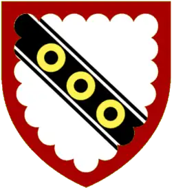 Argent on a bend cottised Sable three annulets Or within a bordure engrailed Gules.