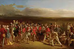 In 1847 Lees completed his depiction of the 1844 grand match at St Andrews in an oil painting, The Golfers, which has been cited as being "the most famous golfing work of art in the world."[1][4] It shows the annual autumn meeting of October 1844, the scene being set at the 'Ginger Beer Hole' on the Old Course at St Andrews. The match that Lees painted was between Sir David Baird and Sir Ralph Anstruther of Balcaskie against Major Hugh Lyon Playfair of St Andrews and John Campbell, Esq. of Glensaddel. As a portrait painter Lees had painted the true likeness of the actual players and spectators, and a key survives naming them.[4] The original oil painting is owned by the Scottish National Portrait Gallery. An engraving was made by Charles E. Wagstaffe (born 1808) from which prints were produced. In 2006 the National Galleries of Scotland produced a monograph on the painting: 'The Golfers', by P. Lewis and A. Howe.[1]