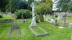 In later years overwork and a peptic ulcer forced him to take time to rest outside the parish. The last service Lowder attended at St Peter's was on 1 August 1880 for a 'High Celebration' to mark the fourth anniversary of the Church of England Working Men's Society. After the service, at which Richard Enraght had preached, the clergy and congregation assembled outside the church where J. B. Spalding, president of the St Peter's CEWMS, presented Lowder with a silver badge of the society, "as a small proof of his many acts of kindness".[6] A few weeks later Lowder died, probably of a perforated ulcer at Zell am See, Austria during a climbing holiday.[7] A requiem mass was held at St Peter's and several hundred clergy and thousands of parishioners attended his burial at St Nicholas', Chislehurst.[4]
