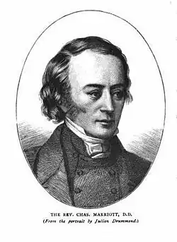 He was born in 1811, the son of a clergyman, John Marriott, who was a friend of Sir Walter Scott. He was educated at home, as his health did not permit him to endure the rigours of a public school. He went up to Balliol College, Oxford in 1829, and gained a first in classics and a second in mathematics. He was annoyed at his failure to get a double first, but his physical strength did not permit him to do the study necessary. In 1833, he obtained a fellowship at Oriel College, and became associated with John Henry Newman. In 1839, he became principal of the Chichester Theological College, preparing young men for the Church of England ministry, but was obliged to resign after two years in poor health.