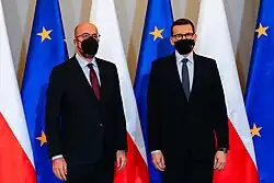 On 27 September 2020, Michel expressed deep concern over the escalation of hostilities in the disputed region of Nagorno-Karabakh and called on Armenia and Azerbaijan to immediately halt fighting and progress towards a peaceful resolution.[21] After French-U.S. and French-Australia relations suffered a period of tension in September 2021 due to fallout from the AUKUS defense pact between the U.S., the United Kingdom, and Australia. The security pact is directed at countering Chinese power in the Indo-Pacific region.[22] As part of the agreement, the U.S. agreed to provide nuclear-powered submarines to Australia. After entering into AUKUS, the Australian government canceled an agreement that it had made with France for the provision of French conventionally powered submarines.[22] The EU called the way France was treated "unacceptable" and demanded an explanation.[23][24][25] Michel denounced a "lack of transparency and loyalty" by the United States.[26]