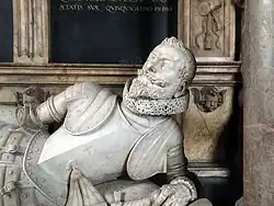 Sir Charles Morrison was buried in the mortuary chapel of the Morrison and Essex families in St. Mary's Parish Church, Watford. His large, elaborate tomb was executed by Nicholas Stone, a celebrated sculptor of the day, and features a reclining effigy of Sir Charles in white marble, depicted with a Van Dyke beard and wearing armour and a large Elizabethan ruff round his neck with a helmet placed behind his legs. Morrison is surrounded by an ornate canopy and pillars of coloured marble, the family coat of arms, and figures of his son and daughter kneel at either end. A long Latin inscription describes his numerous virtues and states that he was the founder of the chapel.[5][6]