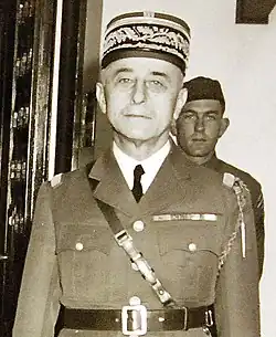 Upon the outbreak of World War II, he was named Commander in Chief of all French Forces in North Africa and announced strict measures against German sympathizers.[4] After the fall of France and the installation of the Vichy puppet regime, Noguès aided the Germans, pursued members of the French Resistance and enforced Vichy laws that targeted Jews.[4] When the Allies invaded North Africa, Noguès initially ordered his troops to resist, but when the Allies gained an upper hand, he ordered them to cease fighting.[4] After the war, Noguès was tried and sentenced for treason.[4]