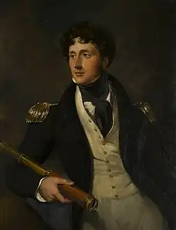 In 1805, Bridgeman was rated as a midshipman, and during the Napoleonic Wars, he saw active service on blockade duty with Robert Calder, later serving in the Dardanelles Operation of 1807 and in the expedition to the Scheldt. In November 1809 he joined HMS Manilla under Captain George Francis Seymour, and on 10 September 1810 was promoted lieutenant in HMS Semiramis. On 1 May 1811 he transferred to HMS Revenge as Flag-Lieutenant to Rear Admiral Arthur Kaye Legge and served at the defence of Cadiz. On 8 March 1813 he joined HMS Bellerophon and on 2 April 1814 the king's yacht HMS Royal Sovereign. He commanded HMS Badger from 12 December 1814 until 28 August 1816, on the West India station, taking part in the invasion of Guadeloupe of 1815. His next command was Icarus, a ten-gun brig-sloop, from 24 June 1817 until 2 September 1819, on the South America station. In 1819 he was promoted captain. His last command, from 7 September 1827 to May 1830, was HMS Rattlesnake, attached to a squadron in the Mediterranean.[2] For most of the years 1827 to 1829 Rattlesnake was cruising off the coasts of Greece during the Greek War of Independence. Her log for the period, kept by Talavera Vernon Anson, survives in a collection at the New York Public Library.[3]