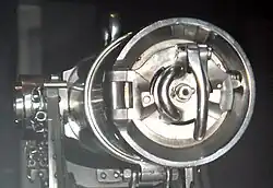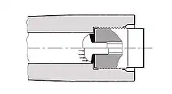 In 1872, de Bange designed the de Bange system, a new type of obturating ring for breech-loading artillery pieces. His system used the same general principle devised by Andrew Hotchkiss ca. 1855 for his rifled muzzle-loading projectiles, wherein two parts of the shell squeezed a soft (in that case lead) ring under the pressure of gunpowder fumes to obturate the barrel (see Rotation of ammunition), and used a breech block made of three parts: an interrupted screw locking mechanism at the rear; a doughnut-shaped grease-impregnated asbestos pad that sealed the breech; and a rounded movable "nose cone" at the front. When the gun fired the nose was driven rearward, compressing the asbestos pad and squeezing it so it expanded outward to seal the breech.[2][3][4] The French referred to the shape of the breech's nose as "mushroom like".