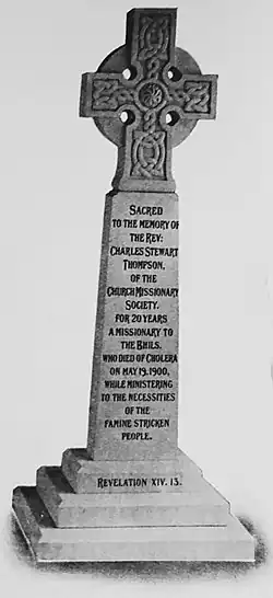 Charles Stewart Thompson died at age 48 on 19 May 1900, during his efforts to relieve the famine-stricken Bhils from their suffering.[1] He had fallen ill from cholera and in an effort to get him to European aid, Bhil people carried Thompson for 9 hours on the road to Kherwara. He died under a tree at noon and was buried at Kanbai, 12 miles from Kherwara.[2]