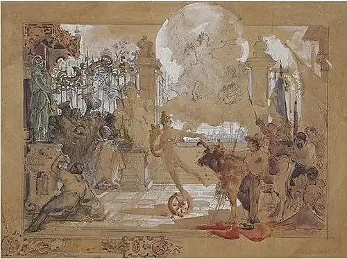 From 1875 to 1888, he worked on a large project: painting historical and allegorical frescoes in the Grand Galerie of the Château de Chenonceau. When they had been completed, he created designs for the Chateau's stained glass. During his work there, he met the writer, Gustave Flaubert, who asked him to illustrate the definitive edition of his novel, The Temptation of Saint Anthony.