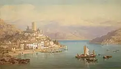 He was a rapid worker, and, besides over two thousand sketches which he left at his death, he often executed twelve to sixteen finished works in one year, and between 1838 and 1881 he exhibited no fewer than 350 at the London exhibitions. His first exhibit at the Royal Academy was, in 1838, ‘Well at Bacharach on the Rhine,’ but the majority of his pictures — 324 works in all — were shown at the gallery of the New Society of Painters in Water Colours, now the Royal Institute of Painters in Watercolours, which he joined in 1846, on the introduction of his friend Louis Hague. His name first appears at the Royal Manchester Institution exhibition in 1842 as a contributor of six drawings, all of buildings in Italy. One of these, ‘Naples with Vesuvius,’ is probably that now in the South Kensington Museum. The British Museum possesses two fairly good examples of his work—‘View of City of Tombs, Cairo,’ 1863, and ‘View in the Forum, Rome’—and many others are in the possession of his widow.[1]