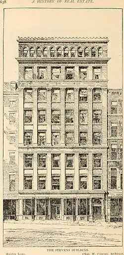 - a cluster of four early skyscrapers on Wall Street, including the Bank of America Building at 44-46 Wall Street (1888–89), the Merchants' National Bank at 31-33 Wall Street, the nine-story Central Trust Company of New York Building at 54 Wall Street (1886–87), and the ten-story Wilks Building at 15 Wall Street (1889–90)[1]