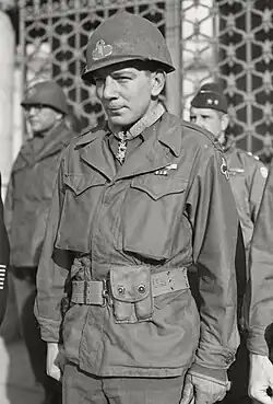 Shea joined the Army from his birthplace of New York City in July 1942,[4] and by May 12, 1944, he was serving as a staff sergeant in Company F, 2nd Battalion, 350th Infantry Regiment, 88th Infantry Division.[3] On that day, near Mount Damiano, Italy, he single-handedly disabled three German machine-gun nests. Soon afterward, he received a battlefield commission as a second lieutenant.[5] Shea was awarded the Medal of Honor eight months later, on January 12, 1945. The medal was presented to him by Lt. Gen. Mark W. Clark on January 17, 1945 during an 88th Infantry Division awards ceremony in Montecatini, Italy.[6]