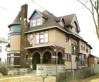 The Charles W. and Nellie Perkins House is a historic building located in Cedar Rapids, Iowa, United States. This 2½-story, wood-frame, Queen Anne was designed by local architect Charles A. Dieman.[2] Dieman himself lived in the same middle and upper-class neighborhood. The house was completed in 1897 for Charles Perkins, who had worked as a cashier in a couple of life insurance companies. By 1928 the house had been converted into an eight-plex. Prominent features include the 2½-story corner tower with a conical roof, the large brick chimney on the main facade, the front porch with round-arched brick columns, the hip roof with dormers of various sizes, the bracketed eaves, the Palladian window and bay window on the east elevation, as well as the oval and rectangular window openings.[2] The house was listed on the National Register of Historic Places in 2002.[1]