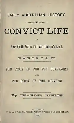 White had an interest in writing about Australian history. He scrupulously collected material and records to use as a basis for his historic writings.[2] In the late 1880s Charles White’s "lengthy series of historical sketches", under the title 'Early Australian History', began to be published in the Bathurst Free Press. Described as articles "bearing upon the work of Australian colonisation and convict life in New South Wales and Van Diemen’s Land", the publishing project was locally advertised, including in the rival newspaper Bathurst Post. The first part of 'Early Australian History' was published on 6 October 1888.[9] White used the pseudonym 'The Chatterer' for these early articles.[10] In 1889 Parts I and II of his 'Early Australia History' were released in book form as Convict Life in New South Wales and Van Diemen’s Land, printed in the White brothers' newspaper office at Bathurst.[11] Charles White’s historical writings display “painstaking scholarship and a fluent, uncluttered style free of romanticism”.[2]