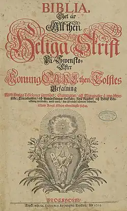 ![]() Title page of Charles XII Bible, printed in Stockholm in 1703. | |