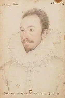 Charles de Balsac, was born around 1547, the third son of Guillaume de Balsac and Louise d'Humières. He had two elder brothers, François de Balsac and Charles de Balsac, seigneur de Clermont and two sisters Louise de Balsac and Catherine de Balsac.[1] His father served under the duke of Guise during the latter Italian Wars, seeing service during the famous defence of Metz.[2] Alongside this responsibility he served as governor of Le Havre.[1] Through his mother Louise the family was connected to the powerful Lorraine dynasty of whom the Humières were clients.[3] The Balsac family were well established in the Massif-Central.[4] They had served the kings of France going back to Jean de Balsac, who fought under Charles VII. His son held responsibilities including Chambellan to the king.[5]