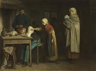 Around 1853 de Groux had his first success with his work The Drunk (Royal Museums of Fine Arts of Belgium) (another version referred to as The farewell on the art market in 2017). It depicts a woman who is lying sick and dying on her bed while her drunk husband holding a bottle is brought in by two young children. The sober palette and the execution that neglected detailed depiction for global effect as well as the subject matter were de Groux' radical break with the Classicist style of Navez in favor of the 17th century genre painters such as Adriaen Brouwer. During this period de Groux painted many compositions depicting the disadvantaged people of his day in their misery and vices such as alcoholism and lassitude. Often he depicted scenes with priests and pilgrimages. He still painted some history scenes in this later phase such as The death of emperor Charles V (Royal Museums of Fine Arts of Belgium) and Frans Junius preaching the Reformation in secret in Antwerp.[6]