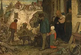 De Groux influenced many young, realistic painters, including his pupil Constantin Meunier and Eugene Laermans. Even the later society painter Gustave Léonard de Jonghe painted early in his career a social realist painting called Pilgrims Praying to Our Lady of the Afflicted or Our Lady of Mercy (1854, Royal Museums of Fine Arts of Belgium), which was clearly influenced by de Groux' social realist works.[4] Vincent van Gogh is known to have admired de Groux's work The blessing before supper. Van Gogh's The Potato Eaters was inspired by this work of de Groux.[12] Van Gogh also praised de Groux for his excellent 'types'. He was of the view that de Groux' studies and drawings displayed the same 'white-hot' passion that he found in the head studies of Frans Hals and Honoré Daumier, and in the novels of Zola and Balzac.[13]
