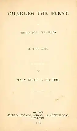 Charles the First is a historical tragedy by the British writer Mary Russell Mitford. It depicts the imprisonment and trial of Charles I before his execution in 1649 following his defeat in the English Civil Wars. It was first written in 1825 and originally intended to be performed at Covent Garden. Mitford wrote the play with the encouragement of William Macready and Charles Kemble, the two leading performers at Covent Garden.[1] However, the politically controversial top of regicide led to it being refused a licence by the Lord Chamberlain, the Duke of Montrose.