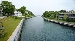 In 1864, settlers built a large dock at the mouth of the Pine River on Lake Michigan. Boats there were exposed to the harsh vicissitudes of Great Lakes weather, so local entrepreneurs sought to connect Lake Michigan to an inland harbor at Round Lake. The Pine River channel was dredged in 1869,[7] connecting Lake Michigan to Lake Charlevoix.[8][9]