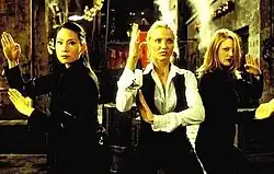 During the making of Blade II, Guillermo del Toro commented that while films like Charlie's Angels had helped to popularize the wire fu style of fighting choreography in Western films, they also served as a "nail in the coffin" and prompted many filmmakers to want to get back to more "hard-hitting" action.[28] In his commentary: "The moment you see Cameron Diaz flying in the air, and you know that she is incapable of flying in the air and kicking five guys... you realize that it is done using wires. [...] I mean, Charlie's Angels was great, but it[s fighting style] was almost satirical".[28]