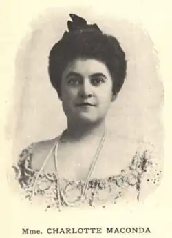 Early in her career, she was sometimes billed as "Carlotta Maconda",[4][5] and toured as a member of the Boston Ideal Opera Company from 1888 to 1890, in the same cast as Jessie Bartlett Davis.[6][7] In 1890 she sang in the operas Der Freischütz, Mignon, Les Huguenots, and L'Africaine, with the Emma Juch Grand English Opera Company.[8][9][10] Maconda sang at the Metropolitan Opera House twice in 1899.[11] In 1903-1904 she and Max Bendix toured with several others as the Maconda Concert Company.[12] "Maconda has such unusual personal magnetism, in addition to a voice of delightful quality," reported a 1907 magazine, "that she quickly becomes a favorite wherever she sings."[13]