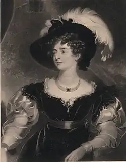In 1825, the Duke and Duchess of Northumberland attended the coronation of King Charles X of France in Reims as representatives of King George IV of the United Kingdom.[2] The Duchess accompanied her husband to Dublin during his time as Lord Lieutenant of Ireland from 1829 to 1830. In 1831, being a friend of King William IV, she was appointed governess of his niece and heir presumptive, Princess Victoria of Kent, who ascended the British throne in 1837. The role was mostly ceremonial, and Victoria continued to rely mostly on Baroness Louise Lehzen. The Duchess was dismissed in 1837 by the Princess's mother, the Duchess of Kent, for attempting to become more influential in the girl's education[3][4][5] and refusing to submit to the Duchess of Kent's comptroller, Sir John Conroy.[6] She had earlier opposed the harshness of the Kensington System, designed by Conroy and the Duchess of Kent, and wrote to Princess Feodora of Leiningen (the Duchess of Kent's daughter and Princess Victoria's elder half-sister) to ask her to tell the King to intervene.[7] Feodora and the Duchess of Northumberland were also determined to protect Baroness Lehzen from the hostility of Conroy and his friend, Lady Flora Hastings.[8]