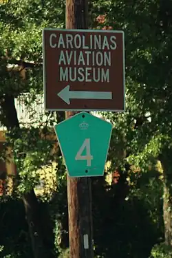 Route 4 is an 18.6-mile (29.9 km) partial ring road located in Charlotte, North Carolina. Beginning and ending at Interstate 85 (I-85), it loops south around Uptown Charlotte along state-maintained secondary roads, connecting the Charlotte Douglas International Airport and several city neighborhoods including Madison Park, Myers Park, Windsor Park and Sugar Creek. The route is posted by the Charlotte Department of Transportation (CDOT), using a modified pentagonal county road shield, with a green background and the city's crown logo above the number.[1][2][3][4] The loop has a radius of about 4 miles (6.4 km), hence the number.[5]